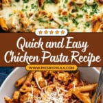 - Garnish and Serve: Finish by topping the dish with Parmesan cheese if desired. Serve immediately and enjoy your quick and delicious chicken pasta meal!