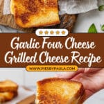 A delicious and indulgent 4 Cheese Garlic Grilled Cheese sandwich made with a blend of provolone, sharp cheddar, gouda, and parmesan cheeses, infused with garlic butter, and grilled to golden perfection on sourdough bread. Perfect for a quick, comforting meal that satisfies cheesy cravings with a savory garlic twist.