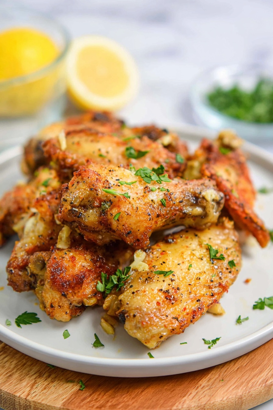 When the wings are done, transfer them to a large bowl. Pour your lemon pepper butter sauce over the wings and toss until they’re all well coated. Sprinkle on that fresh chopped parsley for a touch of color and a fresh flavor burst. Serve immediately while they’re still hot and crispy.