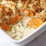 - Assemble the Dish: Pour the cream mixture over the sliced potatoes and gently toss to coat every slice thoroughly. In the prepared baking dish, layer half of the potatoes, arranging white potatoes on one side and sweet potatoes on the other if desired. Sprinkle half of the cheese and breadcrumb mixture evenly over the first layer. Repeat with the remaining potatoes and then top with the rest of the cheese and breadcrumb mixture. Pour any remaining cream mixture evenly over the assembled layers.