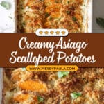 This Asiago Scalloped Potatoes recipe combines thinly sliced sweet and Idaho potatoes baked in a rich mixture of cream, milk, and aromatic spices, layered with a savory blend of Asiago and parmigiano-reggiano cheeses and topped with fine breadcrumbs for a delightful crispy crust. Perfect as a comforting side dish, it marries creamy textures with a cheesy, herb-infused topping that will elevate any meal.