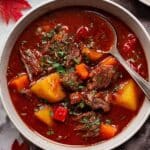 This traditional Hungarian Beef Goulash is a rich, hearty stew made with tender beef chuck, a medley of vegetables, and a generous amount of paprika for authentic smoky flavor. Slow-cooked to perfection in the oven, it delivers a comforting and flavorful meal ideal for chilly days. Served with a sprinkle of fresh parsley, this goulash is perfect on its own or with crusty bread for dunking.