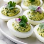 This Avocado Deviled Eggs recipe offers a creamy, flavorful twist on the classic deviled eggs by incorporating ripe avocado and fresh lime juice. Enhanced with red onion, cilantro, and garlic powder, these colorful, healthy bites are perfect as an appetizer or snack for any occasion. Quick to prepare and easy to personalize, they bring a fresh and vibrant flavor to your table.