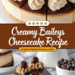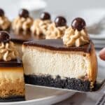This luscious Bailey’s Cheesecake combines a smooth white chocolate cream cheese filling infused with Bailey’s Irish Cream and espresso, nestled on a crunchy Oreo crust. Topped with a rich dark chocolate ganache and espresso-flavored whipped cream, it’s a decadent dessert perfect for special occasions or any time you want to indulge in creamy, boozy cheesecake perfection.