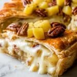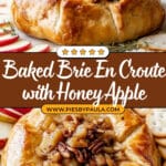 This Baked Brie En Croute recipe features a delicious wheel of brie cheese layered with honey-sauteed apples and toasted pecans, all wrapped in flaky crescent roll dough and baked to golden perfection. It’s an elegant and comforting appetizer perfect for gatherings, served with crackers or baguette slices for a delightful sweet and savory bite.