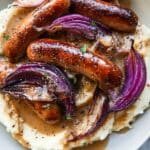 This recipe freezes well—just store the cooked sausages and onions in one container and the gravy separately. Mashed potatoes can also freeze, but I prefer making fresh mash for the best texture. When you’re ready, thaw everything overnight in the fridge for best results.