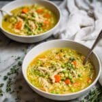 This wholesome chicken soup recipe combines the vibrant flavors of fresh ginger, turmeric, and aromatic herbs with tender chicken and pearl couscous. Perfect for a nourishing meal, it offers a comforting broth filled with vegetables and a subtle warmth from the spices. Easily customizable to be vegan or gluten free, this soup is a versatile favorite for any season.