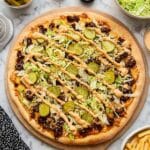 - Final Garnishes: Arrange the dill pickle slices randomly on top, then drizzle the Thousand Island dressing in a decorative pattern across the pizza. Finish by sprinkling the sesame seeds over the top.