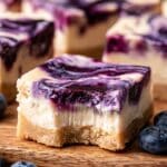 Delicious and creamy Blueberry Cheesecake Bars featuring a buttery shortbread crust, rich cheesecake filling, and a homemade blueberry jam swirl. Perfectly balanced between tart and sweet, these bars make an impressive dessert suitable for any occasion.