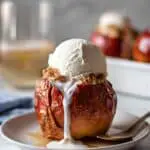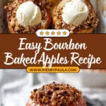 This Bourbon Baked Apples recipe features tender honeycrisp apples stuffed with a delicious mixture of oats, brown sugar, flour, cinnamon, and butter, then baked to perfection in apple cider and bourbon. The warm, caramelized apples paired with the boozy sauce and served with cinnamon or vanilla ice cream make for an irresistible dessert perfect for fall or any cozy occasion.