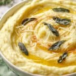 - Serve and Garnish: Transfer the mashed potatoes to a serving dish. Drizzle with the remaining browned butter infused with sage and thyme leaves for an aromatic and visually appealing finish. Add extra Parmesan cheese on top if desired.