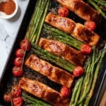 This Brown Sugar Broiled Salmon recipe features tender salmon fillets coated in a sweet and spicy brown sugar glaze, broiled to perfection alongside asparagus, broccolini, and cherry tomatoes. It’s a quick and easy meal that delivers a delightful combination of caramelized flavors and fresh, vibrant vegetables, perfect for a healthy weeknight dinner.