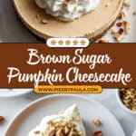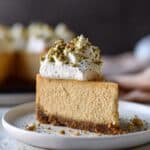 This Brown Sugar Pumpkin Cheesecake with Pistachio Macaroon Crust is a rich and creamy fall dessert featuring a nutty, sweet crust made from pistachios and coconut. Infused with warm spices like cinnamon, ginger, nutmeg, and cloves, the pumpkin cheesecake offers a luscious texture enhanced by a crunchy pistachio coconut crumble topping and whipped cream.