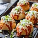 Mozzarella-Stuffed Buffalo Chicken Sliders are a flavorful and fun appetizer or party snack featuring juicy ground chicken meatballs stuffed with gooey mozzarella cheese, coated in spicy Frank’s Red Hot sauce, and baked inside soft dinner rolls. Topped with melted mozzarella, crumbled blue cheese, and fresh green onions, these sliders deliver a delicious buffalo wing-inspired taste in an easy-to-eat slider format.