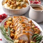 Slice the turkey breast against the grain, arrange on a platter, and drizzle that luscious pan gravy over it or serve on the side. I love when the whole family digs in and the plates come back clean — the sign of a great meal!