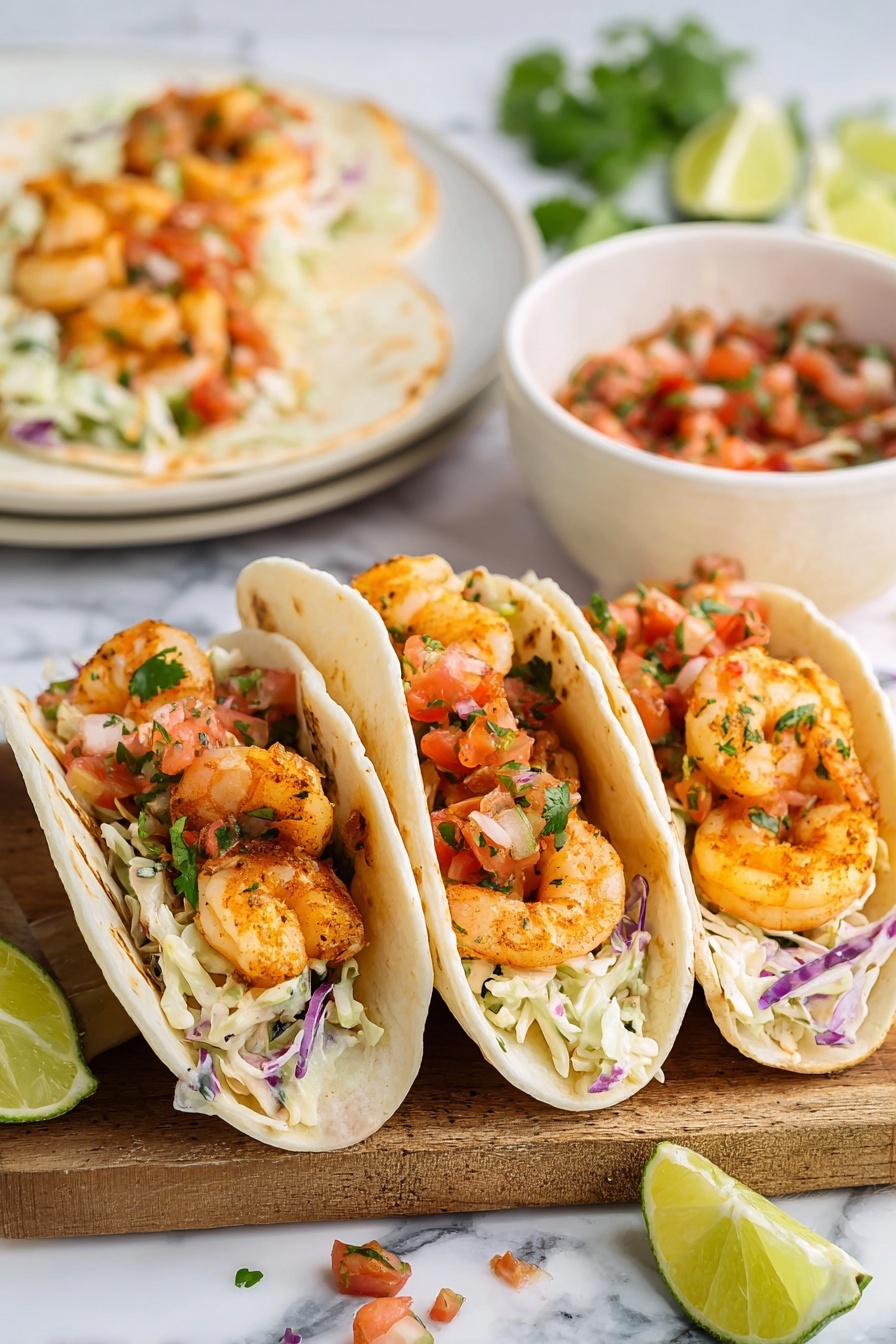 These Cajun Shrimp Tacos are a flavorful and quick meal perfect for any night of the week. Juicy shrimp tossed in Cajun seasoning and garlic are pan-seared to perfection and served atop a creamy, tangy coleslaw blend in warm flour tortillas. The combination of spicy, creamy, and fresh ingredients offers a satisfying and vibrant flavor profile that is sure to be a crowd-pleaser.