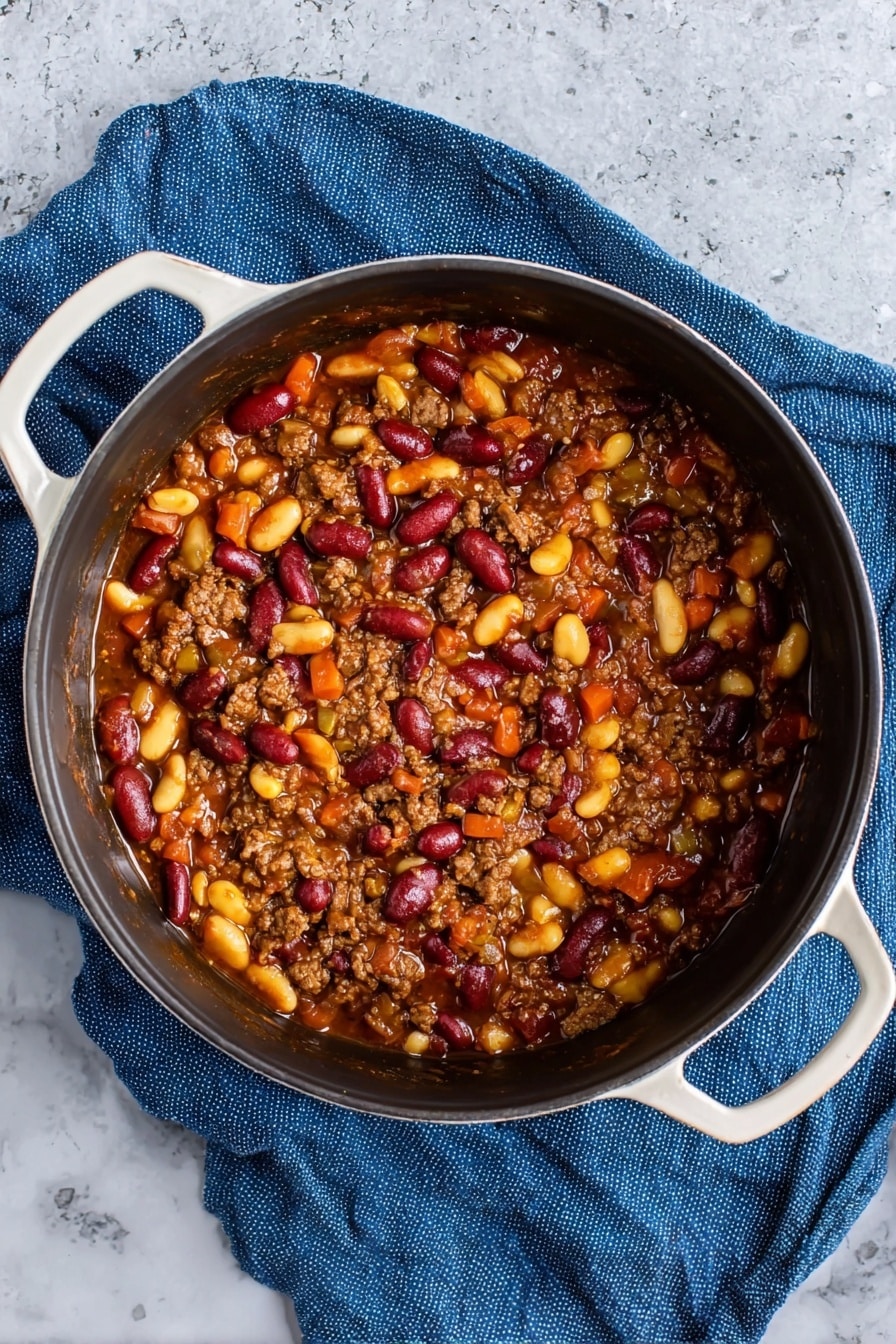 Start by heating a skillet over medium-high heat. Add your ground beef, bacon slices, and diced white onions all at once. Stir occasionally and brown everything until the beef is fully cooked and the bacon is crisp but not burnt—about 8 to 10 minutes. This step releases the smoky fats that will flavor the beans beautifully. Once cooked, drain off any excess grease to avoid sogginess in the beans later.