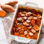 - Assemble the dish: Arrange the sweet potato rounds in layers inside the buttered baking dish. Season each layer with kosher salt and freshly ground black pepper to taste. Once all potatoes are layered, pour the warm syrup evenly over the top.