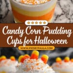 This Candy Corn Layered Pudding Dessert Cups recipe creates a festive and colorful treat perfect for Halloween or any autumn celebration. Layers of creamy vanilla pudding and orange-tinted pudding topped with whipped cream and decorated with candy corn and colored sugars make for a fun and visually appealing dessert that’s easy to assemble and delightfully sweet.