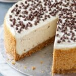 This Cannoli Cheesecake recipe combines the creamy richness of ricotta and mascarpone cheeses with the classic crunch of a graham cracker crust, topped with a luscious whipped cream and mini chocolate chips. Baked in a water bath to ensure a smooth, crack-free finish, this dessert perfectly captures the flavors of a traditional cannoli in a rich, creamy cheesecake form.