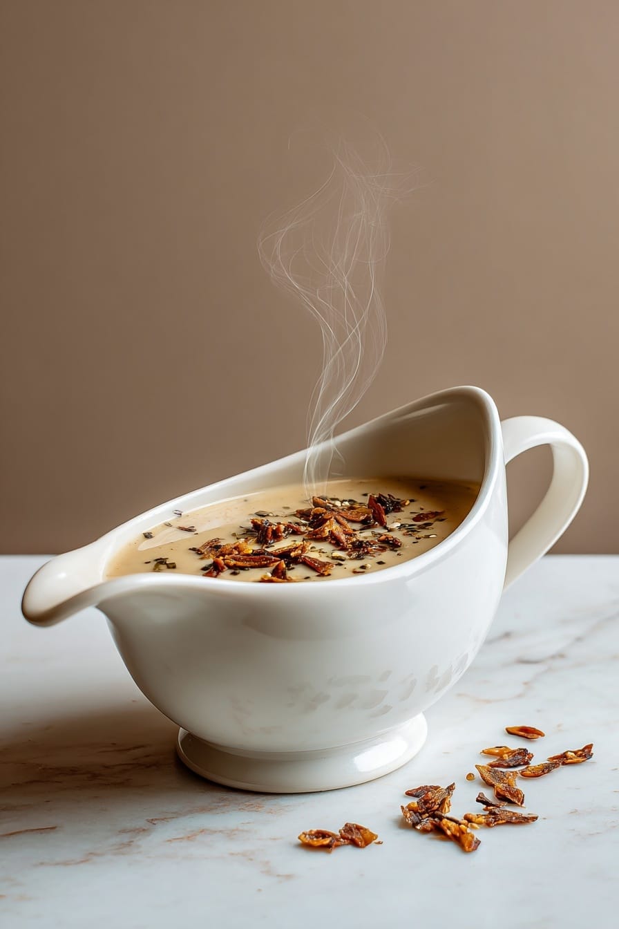 I like to finish this gravy with a sprinkle of freshly chopped fresh parsley—it brightens up the color and adds a touch of fresh herbiness that balances the richness. Sometimes I toss in a pinch of cracked black pepper for a final little pop. These small touches make the presentation feel special without hiding that gorgeous caramelized shallot and bacon texture.