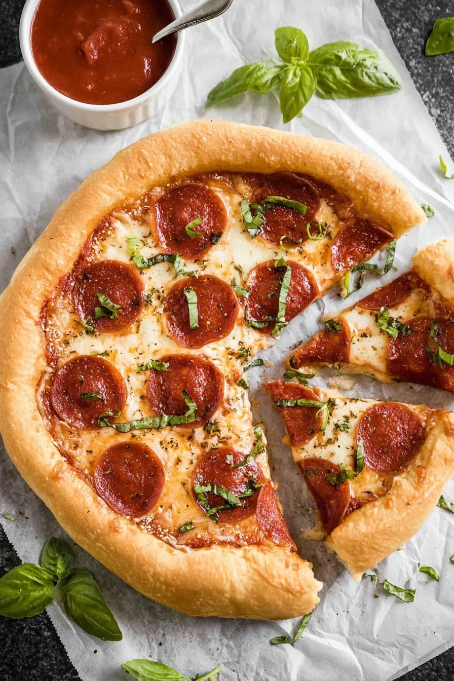 Once plated, sprinkle fresh basil on top — the brightness it adds really finishes this Cast Iron Skillet Pepperoni Pizza Recipe beautifully.