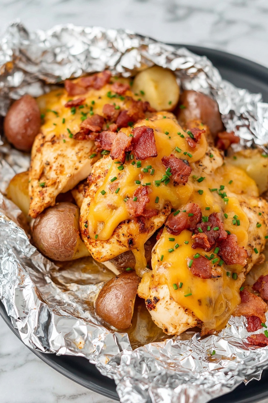 This Chicken Foil Packet recipe offers a delicious and easy way to prepare a complete meal featuring tender chicken breasts, petite red potatoes, savory spices, and cheesy bacon toppings all cooked together in foil packets. Oven-baked to perfection, the foil packets ensure juicy chicken and flavorful potatoes with a melty colby jack cheese and crispy bacon finish. Ideal for a convenient yet hearty dinner, it’s simple to make and clean up.