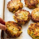 - Shape Fritters: Measure about ¼ cup of the mixture and press it into a round fritter shape approximately 6 cm (2.25 inches) wide and 1 cm (2/5 inch) thick. Note they will shrink slightly and become thicker when cooked.