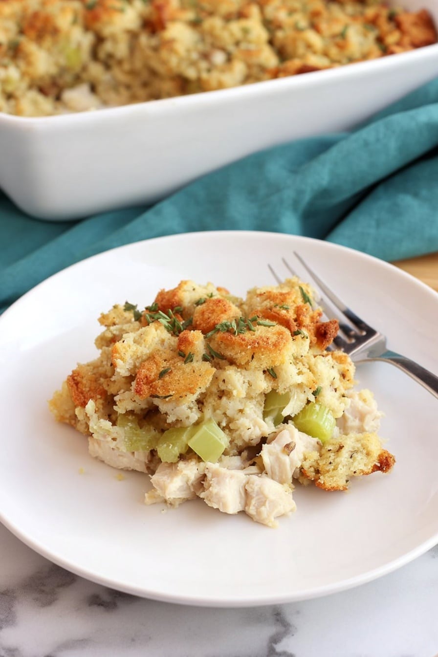For holidays or dinner parties, I’ve dressed up this Chicken and Stuffing Casserole Recipe by serving individual portions in ramekins topped with a sprig of fresh rosemary. It feels fancy but remains easy to make. Another trick I love is layering a thin slice of cheddar cheese beneath the stuffing for an oozy surprise when you cut in—guaranteed to impress your guests!