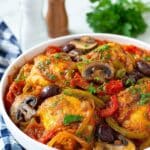 Chicken Marengo is a classic French dish featuring succulent bone-in, skin-on chicken thighs cooked in a rich tomato-based sauce with mushrooms, olives, green peppers, and a splash of white wine. This comforting, savory stew brings together aromatic vegetables and bold flavors for a hearty meal perfect for family dinners.