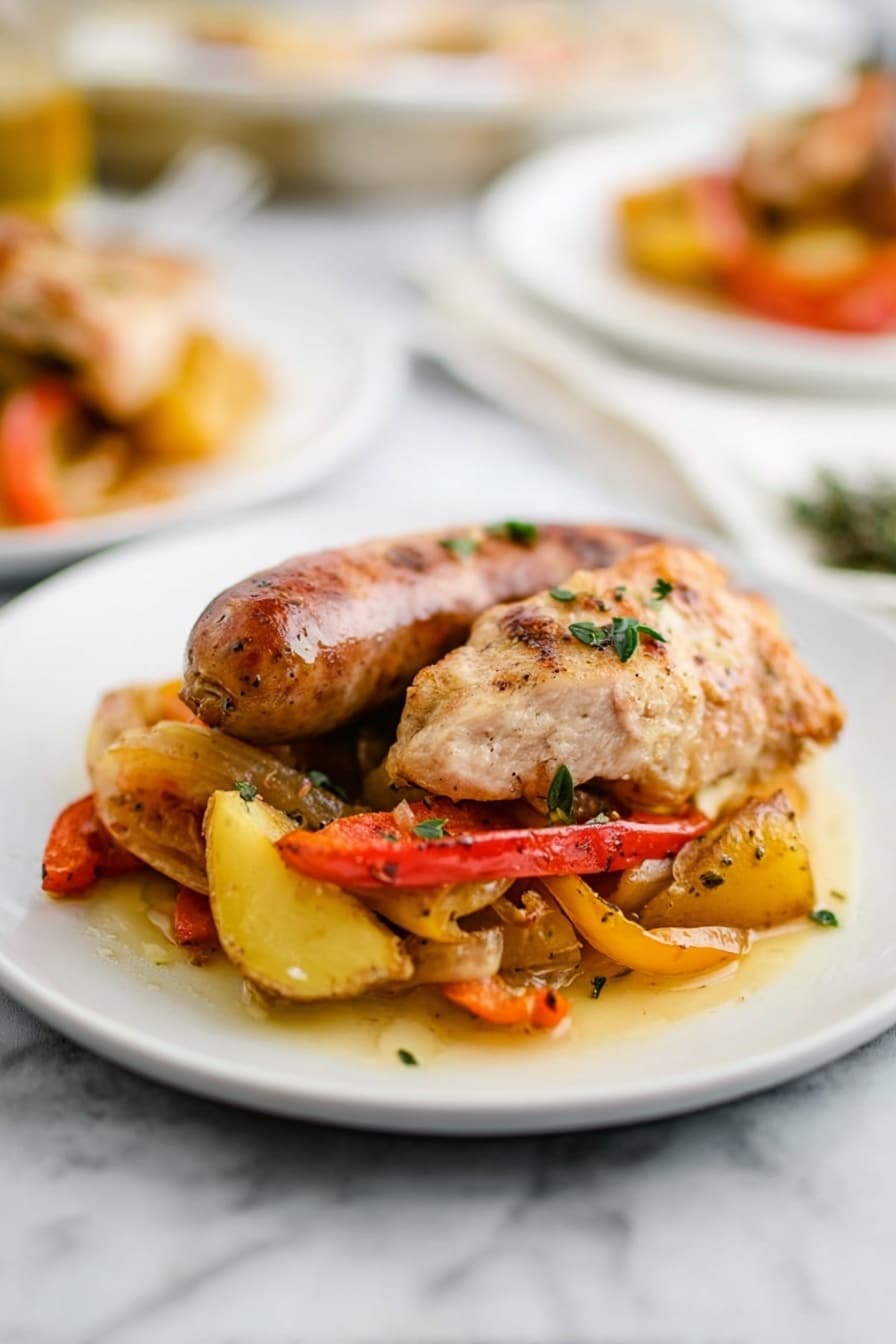 Heat olive oil in a large, oven-safe skillet over medium-high heat, then place the chicken skin-side down. Let it cook undisturbed for about 5 minutes until that skin is beautifully golden and crisp. Flip and cook for another 5 minutes. Don’t rush this—it’s the foundation of flavor and texture you’ll love. If your pan is small, you might need to do this in batches. Remove chicken and keep it safe on a plate while you cook the sausage.