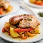 - Serving Size: 1 serving (approximately 1 chicken thigh and sausage portion with sauce)