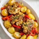 Chicken Scarpariello is a flavorful Italian-American dish featuring crispy roasted potatoes, seared bone-in chicken thighs, and Italian sausage simmered in a tangy, spicy sauce made with pickled cherry peppers, white wine, and herbs. This hearty dish combines roasting and stovetop searing to deliver a perfect blend of textures and bold flavors, ideal for a comforting weeknight dinner or satisfying weekend meal.