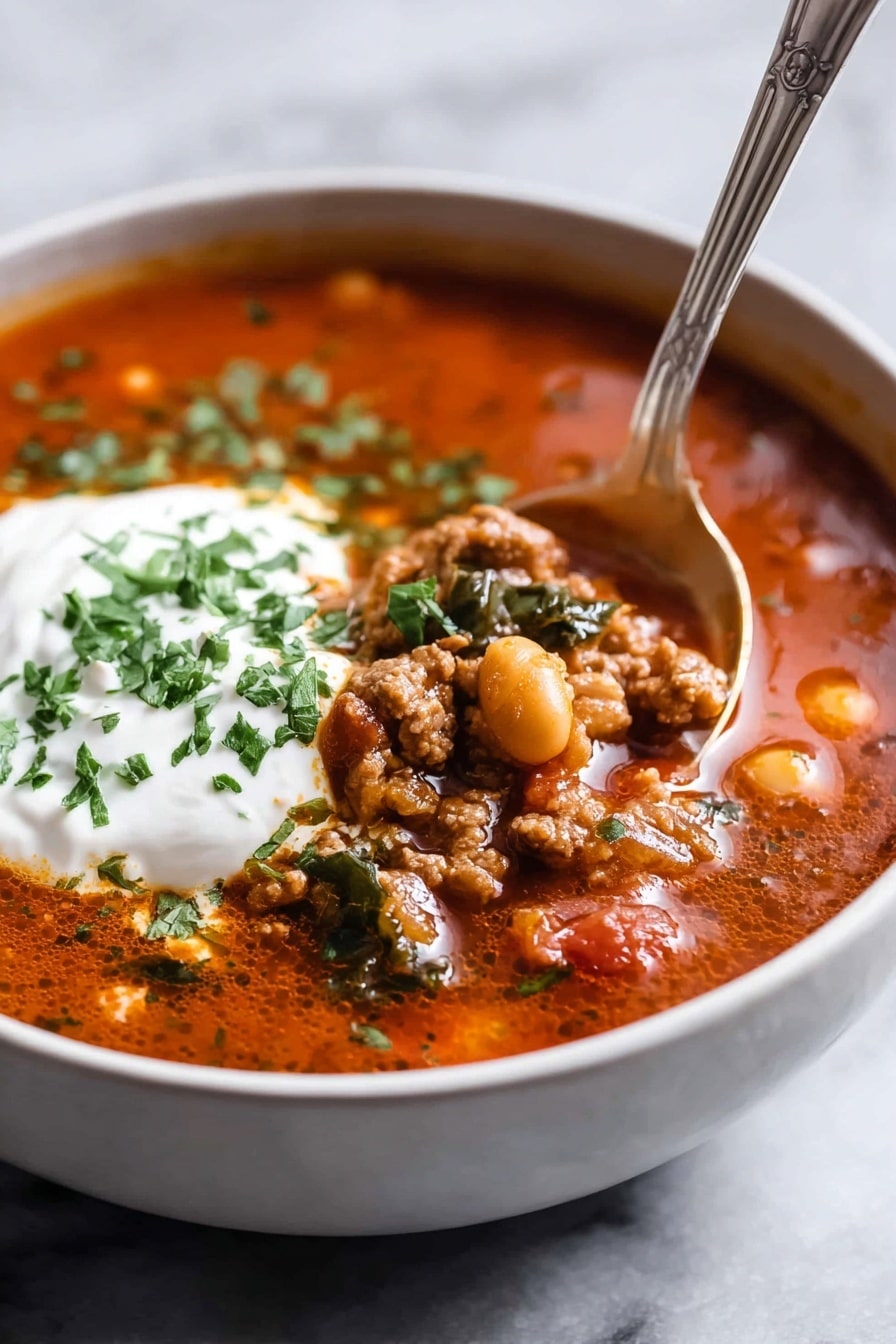 This hearty Chickpea Lamb Shawarma Soup combines fragrant Middle Eastern spices with tender lamb mince, chickpeas, and fresh spinach in a comforting, flavorful broth. Perfect for a nourishing weeknight meal, it’s garnished with cooling yogurt and fresh coriander for a delightful contrast.