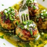 This Chimichurri Meatballs recipe features tender pork and beef meatballs fried to golden perfection, served with a zesty and fragrant chimichurri sauce made from fresh parsley, oregano, and red wine vinegar, topped with crumbled feta cheese for a delightful Mediterranean-inspired flavor.
