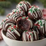These Chocolate Christmas Tree Cake Truffles are a festive and delicious treat made by crumbling Little Debbie chocolate Christmas Tree Cakes into a soft dough, mixing in colorful sprinkles, and then dipping the formed truffles in rich melted semi-sweet chocolate. Finished with a drizzle of white chocolate and extra sprinkles, these bite-sized delights are perfect for holiday celebrations and easy to make in under 30 minutes.
