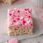 - Dip and Decorate: Dip half of each Rice Krispie bar into the melted candy mixture, then place them on a parchment-lined baking sheet. Immediately sprinkle with Valentine’s Day sprinkles for a festive touch. Let them set for a few minutes until the coating hardens.