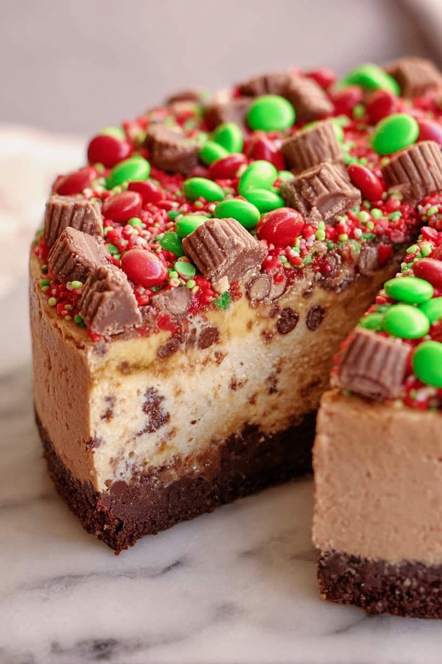 I usually top this cheesecake with chopped mini Reese’s and crushed colorful holiday M&M’s because they add fun texture and that bursts of chocolate and peanut butter flavor I can’t resist. For a more elegant touch, shaved dark chocolate or a dusting of cocoa powder works wonderfully, too. Fresh raspberries or cherries can also balance the richness beautifully.
