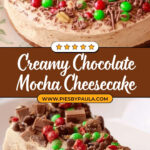 This decadent Chocolate Mocha Cheesecake combines a crunchy graham cracker and almond crust with a rich cream cheese filling studded with chocolate-covered Heath bars. Topped with a luscious mocha whipped cream and festive candy garnishes, it’s the perfect dessert for chocolate and coffee lovers alike.