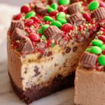 - Frost and garnish: Spread the mocha whipped cream evenly over the top of the cheesecake. Garnish with chopped Mini Reeses and crushed Holiday M&M’s for a festive touch.