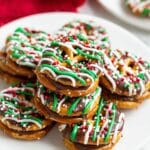 These Christmas Caramel Pretzel Bites are a festive and delicious holiday treat featuring soft caramel sandwiched between crunchy mini pretzels and drizzled with colorful red, green, and white candy melts. Topped with holiday sprinkles, they’re perfect for sharing or gifting during the holiday season.