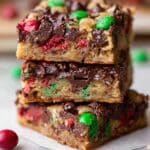 - Top with M&M’s and Remaining Chocolate: Sprinkle the holiday M&M’s evenly over the top, followed by the remaining chocolate chips for a colorful and decadent topping.
