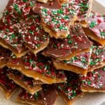 One of my favorite presentation ideas is stacking these Christmas Saltine Crackers with Chocolate Recipe shards on a festive platter with sprigs of rosemary or holly sprigs for color. You can also layer them in decorative tins filled with parchment paper so they make delightful gifts. Last year, I tied a ribbon around small boxes filled with these crackers, and they made the perfect hostess gift!