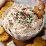 Transfer your dip to a serving bowl and top with a generous sprinkle of Christmas sprinkles for that extra festive flair. If you want to be extra fancy, I like placing an additional Christmas tree cake on top as a cute garnish. Serve this sweet dip alongside an assortment of cookies, pretzels, or even fresh fruit—everyone loves using dippers!