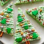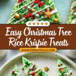 These festive Christmas Tree Rice Krispie Treats are a fun and easy holiday dessert that combines crispy rice cereal with gooey marshmallows, green food coloring, and festive decorations. Perfect for holiday parties or family gatherings, they are decorated with white chocolate, pretzel sticks for tree trunks, and colorful sprinkles for a cheerful touch.