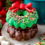 Celebrate the holiday season with these festive Christmas Wreath Cookies! Made from pinwheel cookies dipped in luscious green melting chocolate and adorned with Twizzlers bows and colorful sprinkles, these charming treats are perfect for holiday parties or gifting.
