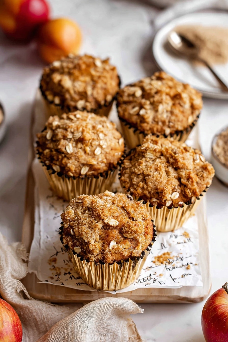 Mix together the topping ingredients in a small bowl—brown sugar, oats, flour, butter, and cinnamon—until crumbly. Sprinkle a generous spoonful on top of each muffin; that crispy topping is what takes these from good to unforgettable.