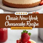 This classic New York cheesecake recipe features a rich, creamy filling made from cream cheese, sour cream, heavy cream, and eggs poured over a buttery graham cracker crust. Baked in a water bath for a smooth texture and crack-free finish, it is topped with a homemade strawberry sauce made from fresh strawberries, sugar, and orange juice. This dessert delivers the perfect balance of sweetness and tang, ideal for any special occasion or indulgent treat.