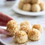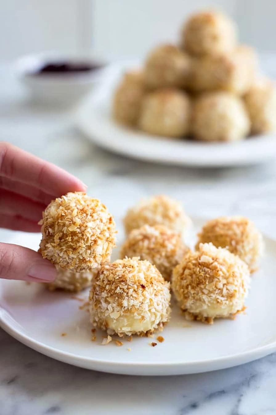 Set up a dredging station with beaten eggs and coconut milk in one shallow bowl, and a mixture of panko, shredded coconut, and a pinch of pepper in another. Dip each ball into the egg mixture, then roll it in the coconut-panko mix until fully coated. Place them on a parchment-lined baking sheet. Bake at 475°F for 10-15 minutes, checking around 8 minutes to rotate the tray for even browning. Keep an eye out—overbaking will cause the brie to ooze out, and trust me, you want that cheese contained!
