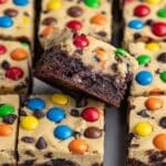 Indulge in decadence with these Cookie Dough Brownies, featuring a rich fudge brownie base topped with a luscious layer of edible cookie dough studded with mini chocolate chips and colorful mini M&M’s. Perfectly baked and chilled, these treats offer a delightful contrast of textures and flavors, combining the classic fudgy brownie with safe-to-eat cookie dough for an irresistible dessert experience.